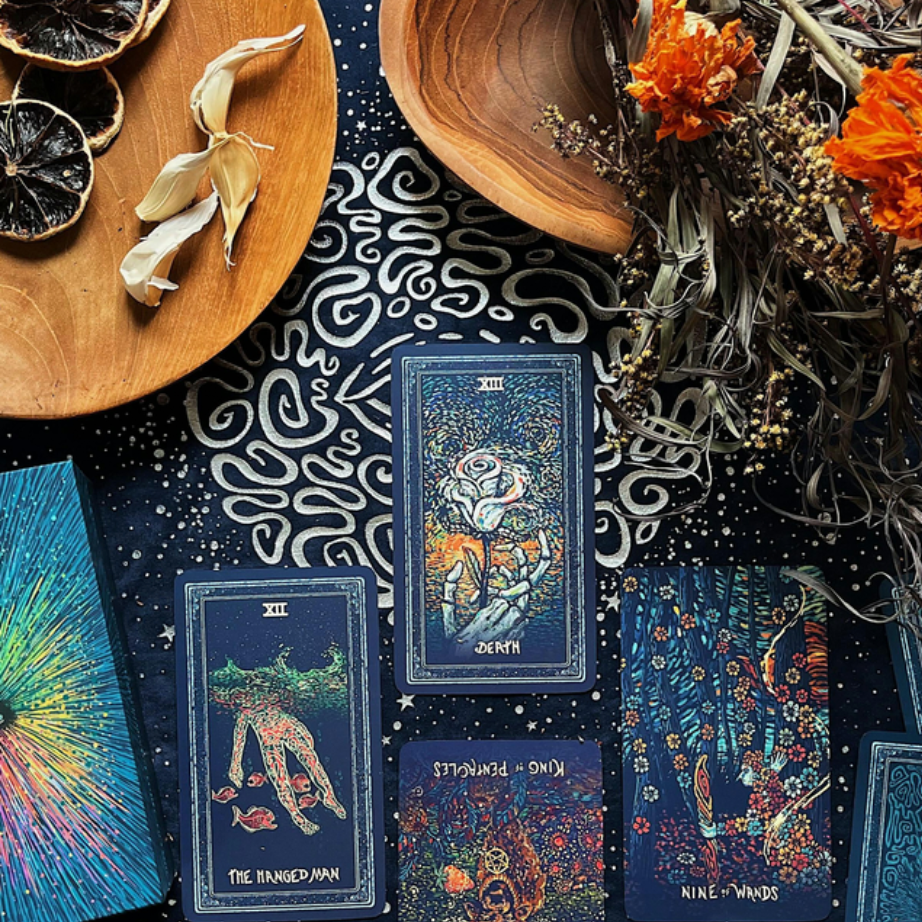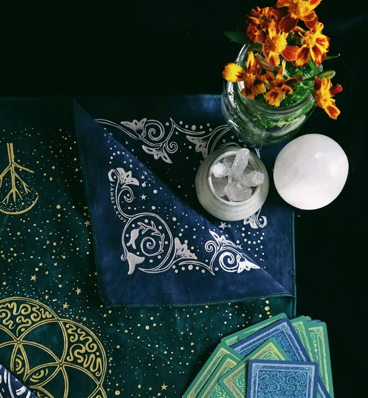 A 22” x 22” double-sided faux suede altar cloth that honors both the Cosma Visions Oracle and the Prisma Visions Tarot. One side is teal fabric with screen printed gold, representing Cosma Visions, and the other side is navy fabric with screen printed silver, representing Prisma Visions.