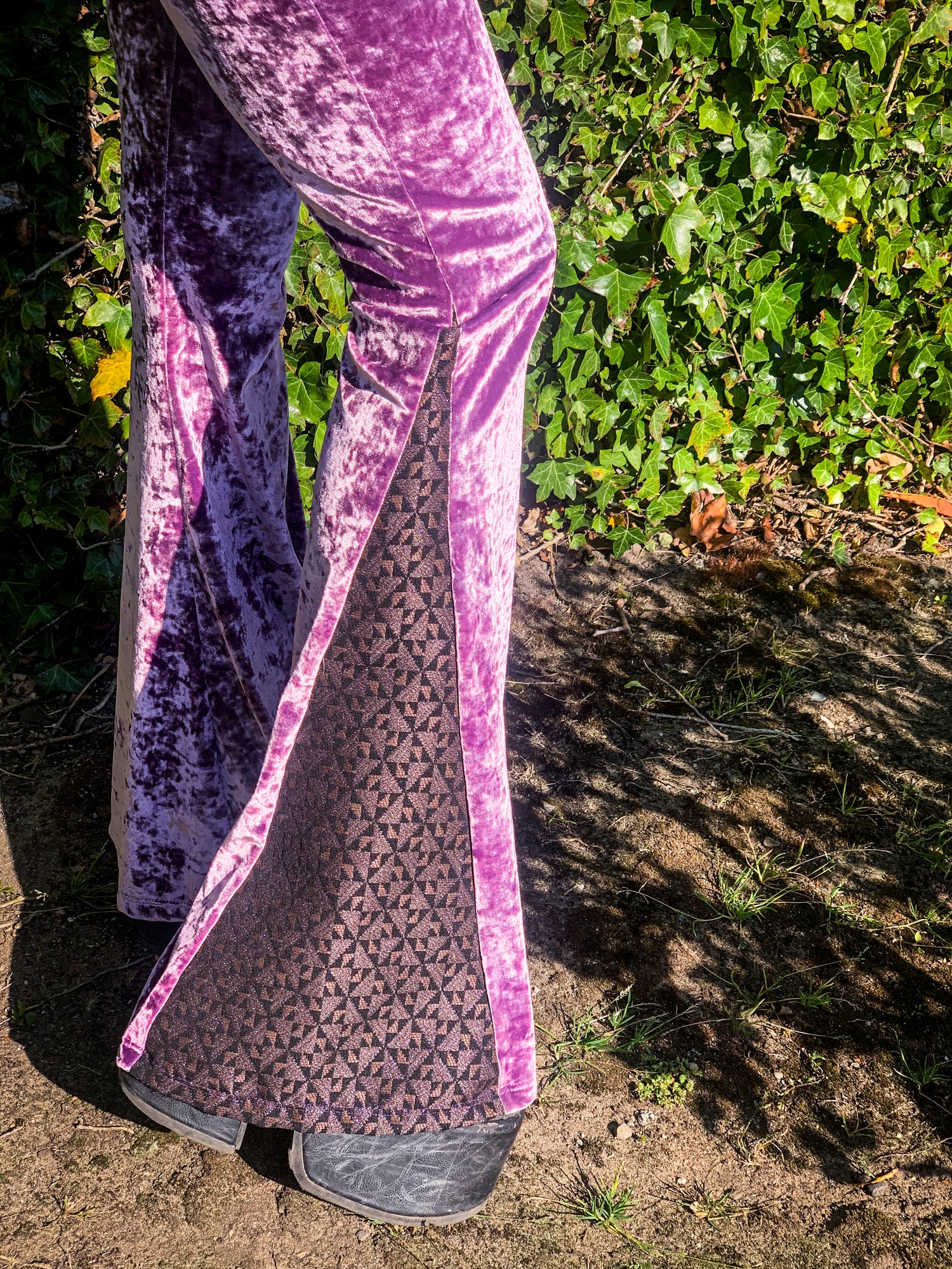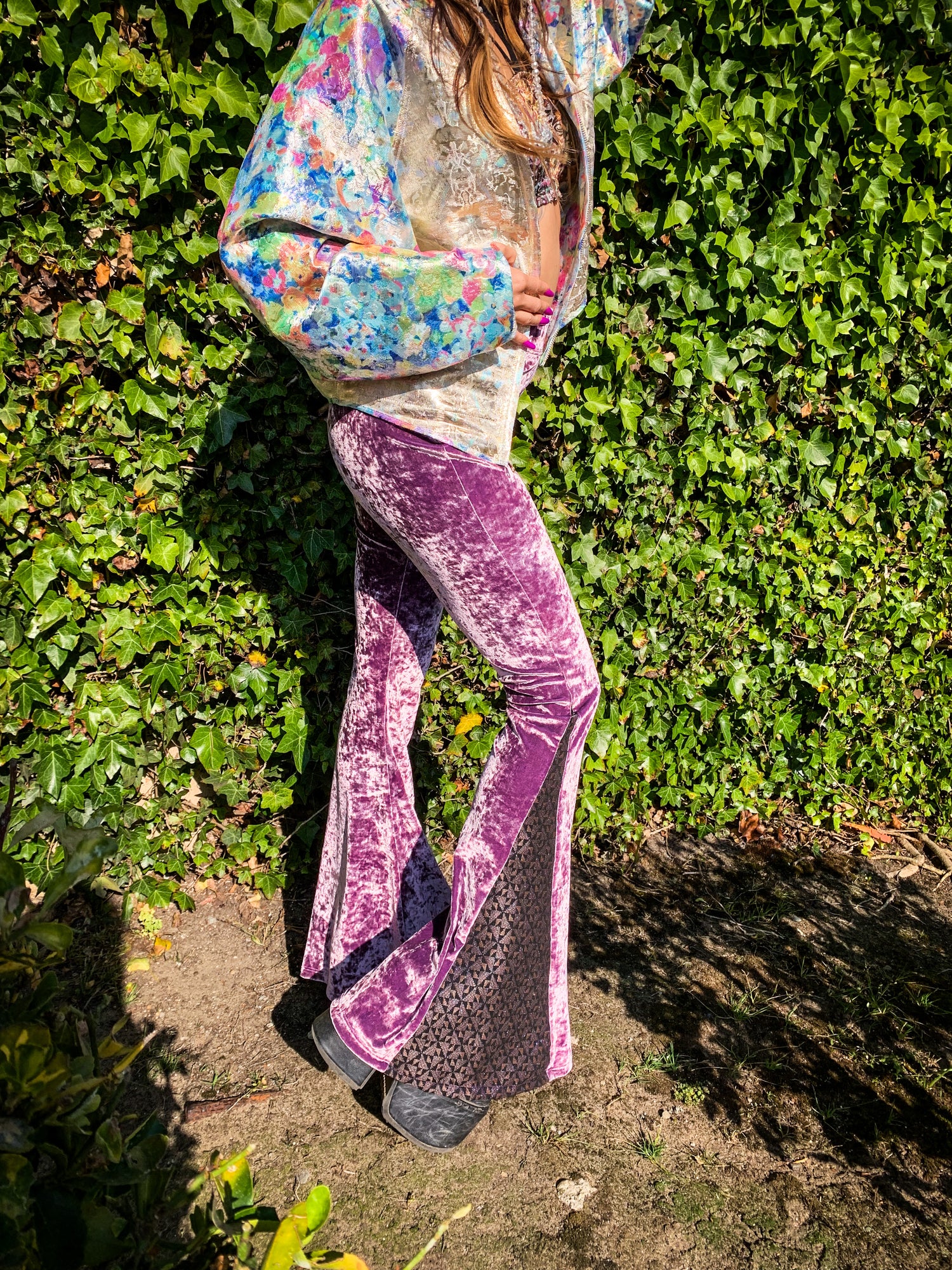 Lavender color high waist crushed velvet flare pants made with luxury crushed velvet fabri and a contrast panel at ankle, thick elastic waistband, stretchy, body hugging fit, it so flattering and comfortable. Glitter free, Moop-free, iridescent sparkle will not fade.
