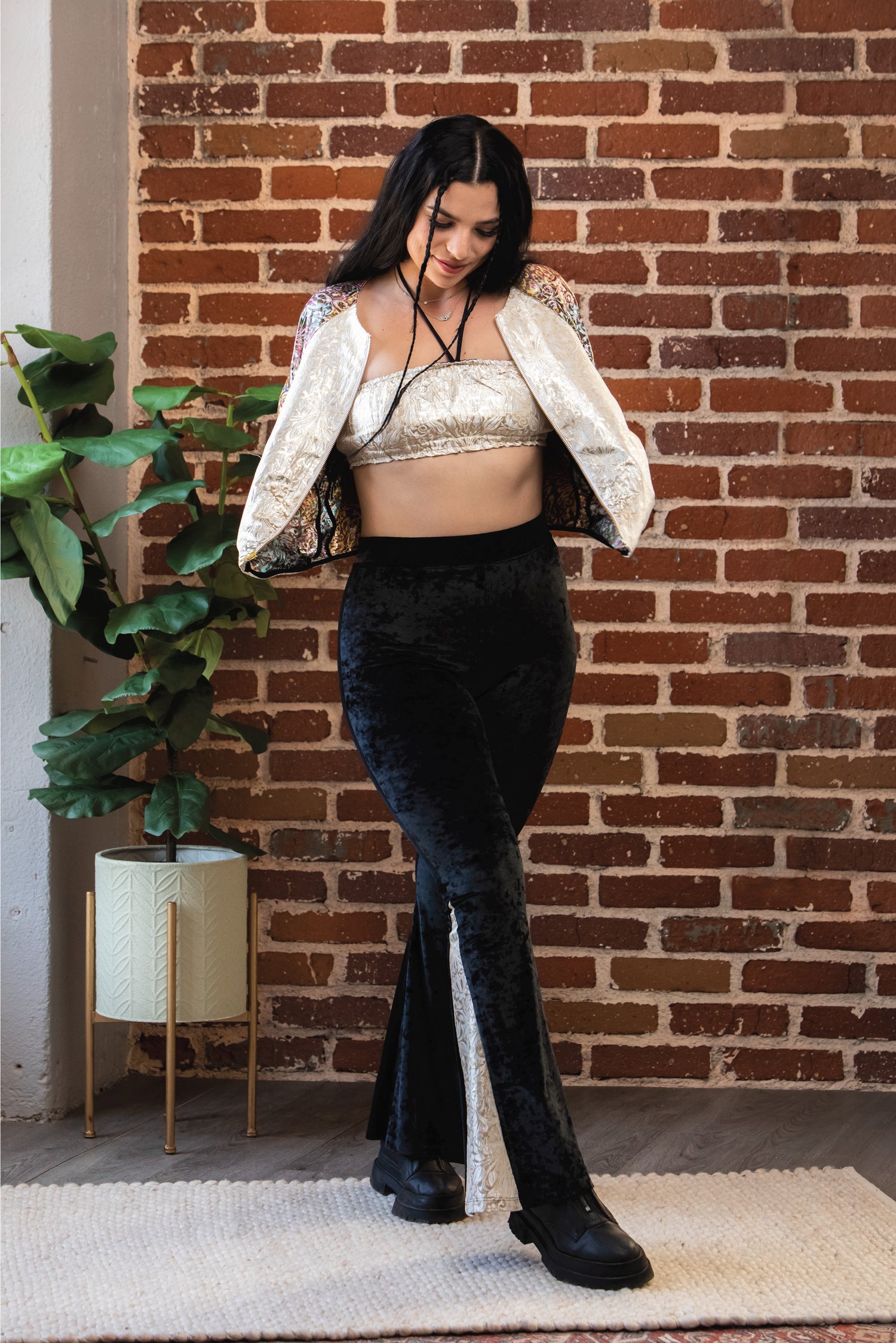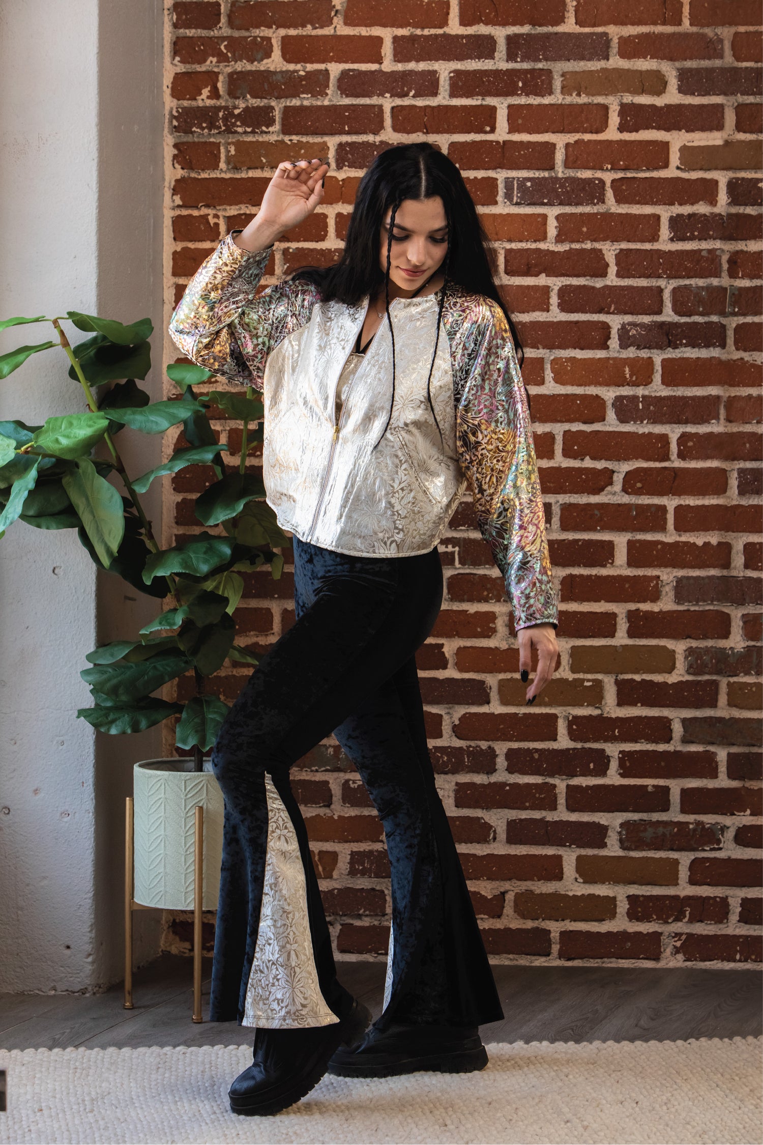 Made of medium weight brocade fabric woven with metallic threads for ever lasting sparkle, full zipper center closure, side slant outer pockets large enough to fit iphone+ and android devices. Moop-free and iridescent in various light forms with glitter-free sparkle that does not fade. Perfect for music festival and transformation gathering spaces. Matching sets are also an option. Brocade fabric is luxury quality and inside is sealed and finished.