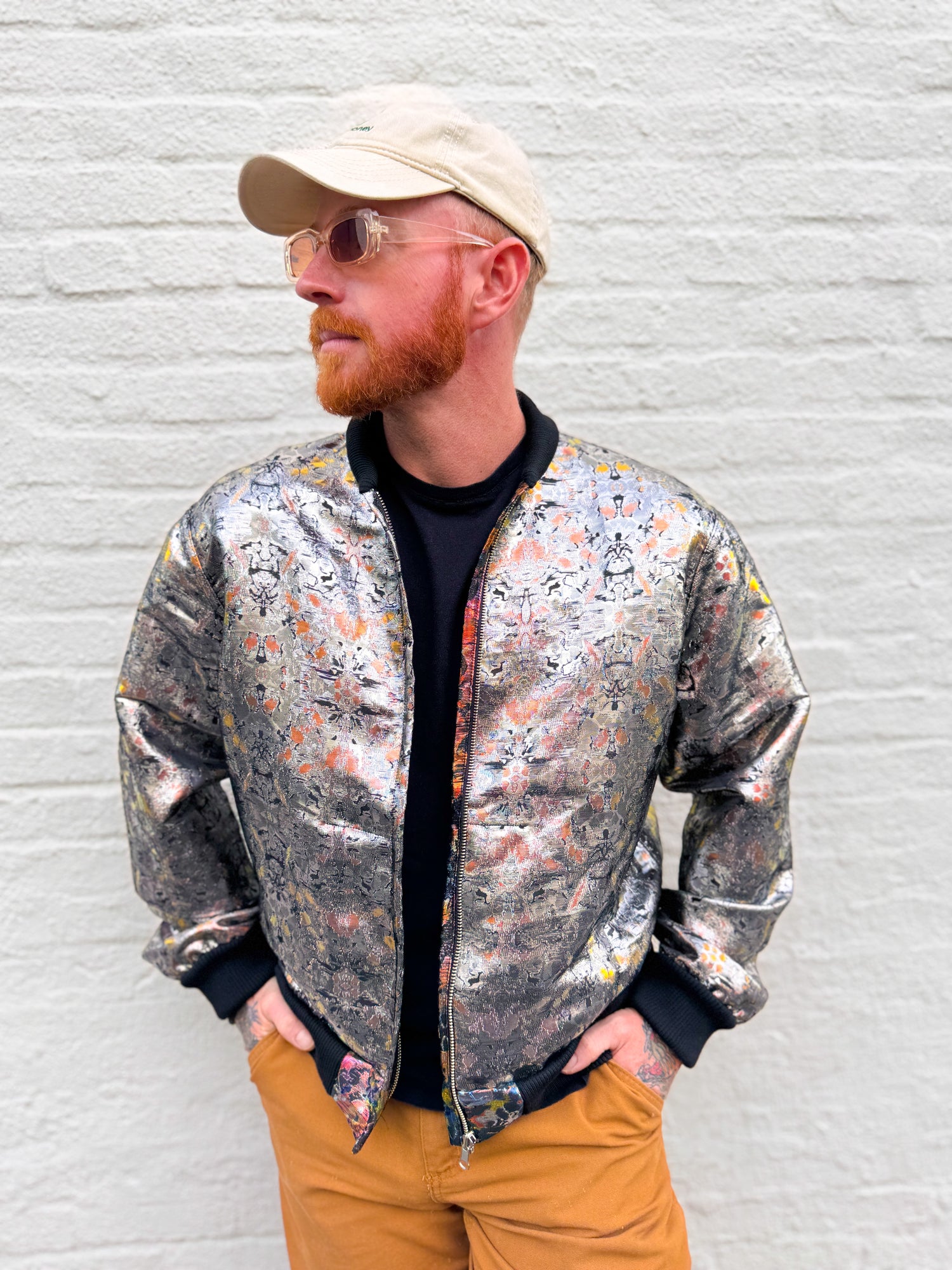 Crafted from metallic French jacquard, this bomber is fully reversible giving you two jackets in one. On one side: bold, colorful, textured jacquard that catches the light and turns heads... like seriously. On the other: a sleek, pared-back metallic finish for low-key nights and subtle look.