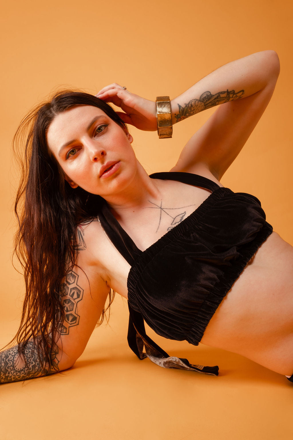 This color is so unique! Our dreamy Metallic Mauve Crushed Velvet Reversible Bandeau Halter Top is made from soft and comfy stretch velvet. This top is not only comfortable, but also versatile with convertible halter tie straps and an option for reverse wear featuring solid black velvet designed to match any outfit. Perfect for a full-busted fit. Pair it with our matching flare pants for a cozy yet luxe and dreamy look for the festival, high street, ceremony and beyond.