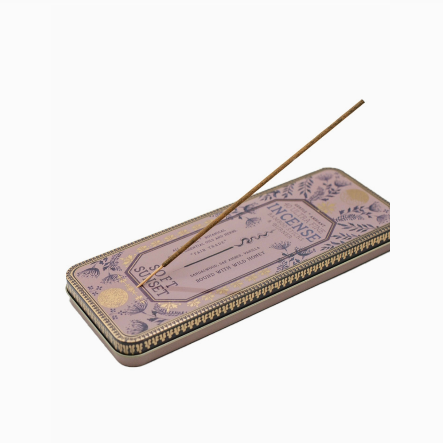 SOFT SUNSET is a gentle, fine ambient incense with notes of Sandalwood, Sap Amber and Vanilla. Bound with wild honey.