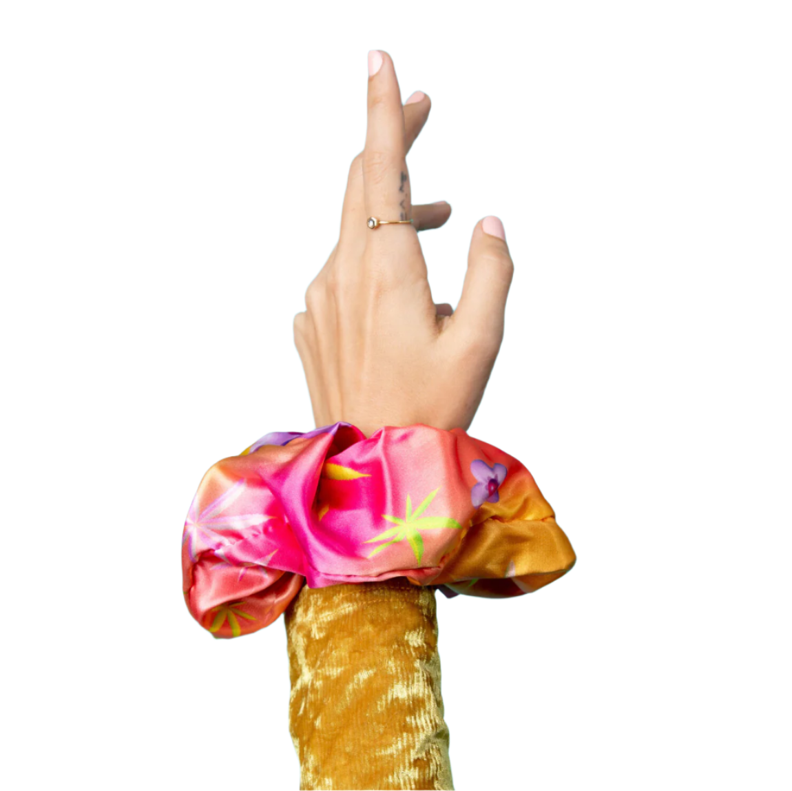 Adorn your hair with the Silk Weed Scrunchie from Broccoli Mag. Made of 100% silk, this large ruffle scrunchie features puffy blossoms and weed leaves floating in a mesmerizing tie-dyed space. Perfect for an effortless "I woke up like this" look.