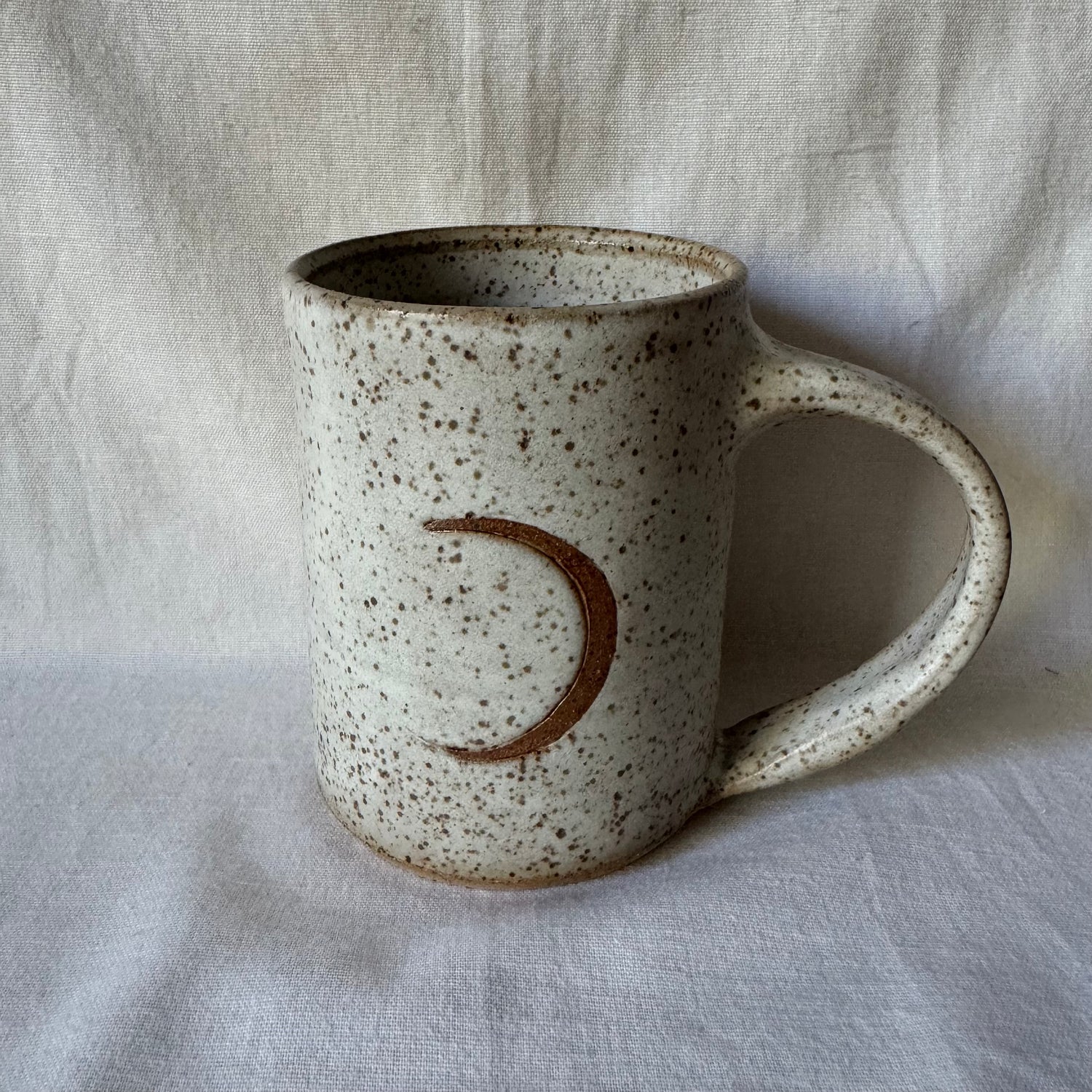 Experience a touch of magic every morning with our Speckled Ceramic Moon Mug. Handcrafted in Bend, Oregon, this coffee mug or tea cup features a raw crescent moon design and is made from speckled stoneware. Its food safe matte glaze and dishwasher/microwave safe material make it perfect for your morning ritual.