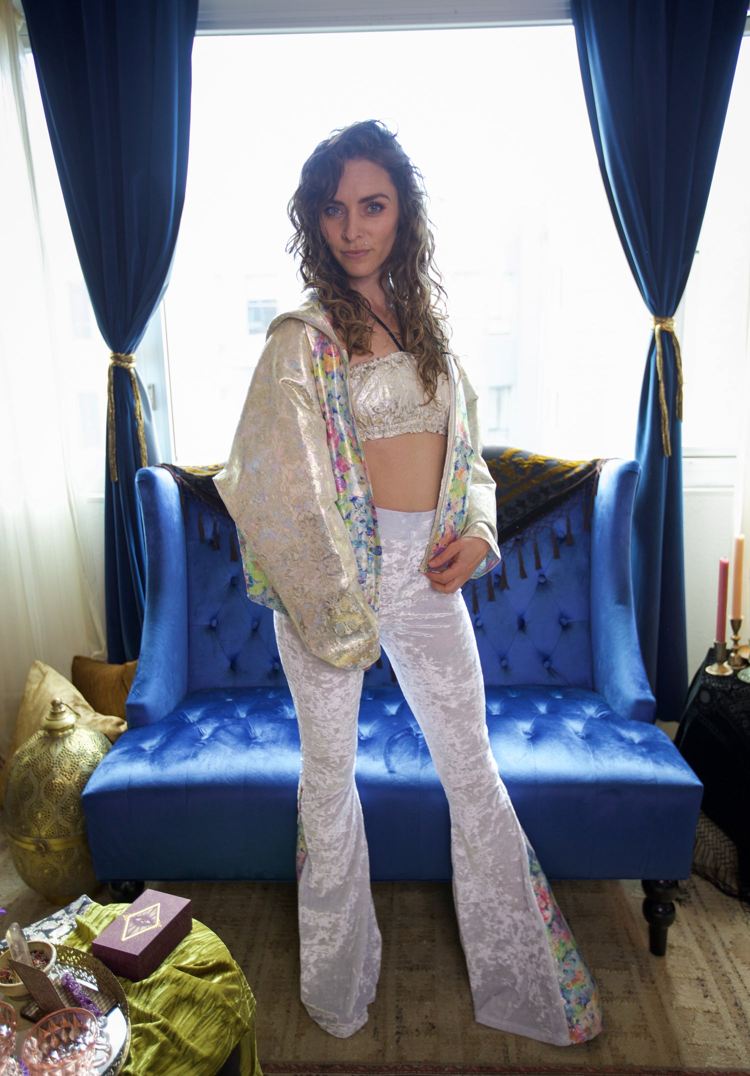 White high waist crushed velvet flare pants made with luxury crushed velvet fabric. Made with a contrast brocade panel at ankle, thick elastic waistband, stretchy, body hugging fit, it so flattering and comfortable. Glitter free, Moop-free, iridescent sparkle will not fade.
